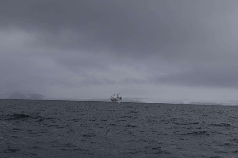 Die für gestern vorgesehene Anlandung kurz vor Mitternacht ist ausgefallen, weil wieder ein Eisbär an Land rumlungerte. So richtig unglücklich war dennoch keiner. Wir hatten absolut mieses Wetter: Starker Wind, hohe Wellen, Schneeregen und Gischt. Eigentlich sind wir dem Eisbären dankbar.